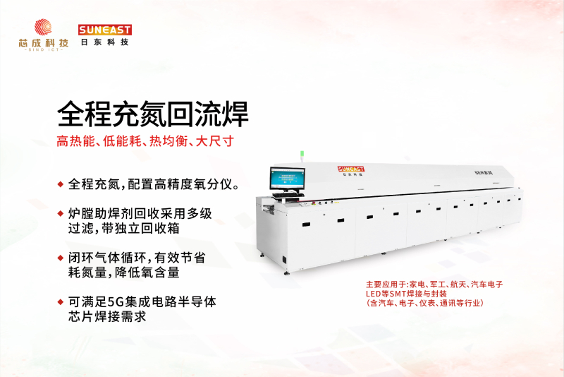 日東科技自主研發的全程充氮回流焊,產品采用最新隔熱技術,全新爐膛設計,控溫能力強,精度高;底部冷卻系統能夠可靠、高效地冷卻復雜PCB板,降低組件應力影響;爐膛助焊劑回收采用多級過濾,帶獨立回收箱;設備全程充氮,配置高精度氧分儀;閉環氣體循環,有效節省耗氮量,降低氧含量;可滿足5G集成電路半導體芯片焊接需求。