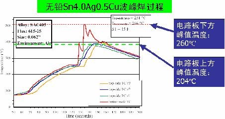 對于Sn-0.7Cu釬料合金+無鉛專用助焊劑/低VOC助焊劑組合而言,焊錫槽的最佳溫度為260-270℃;復(fù)合雙面板一般要比單面板溫度高10~25℃左右;無鉛波峰焊中最好使用Tg高的基板材料,因?yàn)槠溆懈玫淖杩鼓芰Αo鉛波峰焊對于元器件影響不是很大,圖5-28為SAC405釬料在焊接溫度下對不同測試點(diǎn)溫度的測試數(shù)據(jù),可以看出幾條曲線溫度相近。
