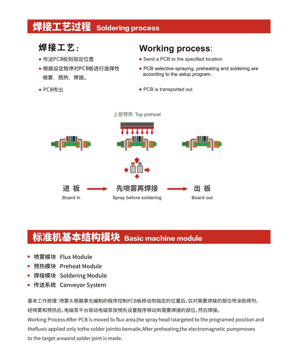 | 噴霧模塊 | 預(yù)熱模塊 | 焊接模塊 | 傳送系統(tǒng) |